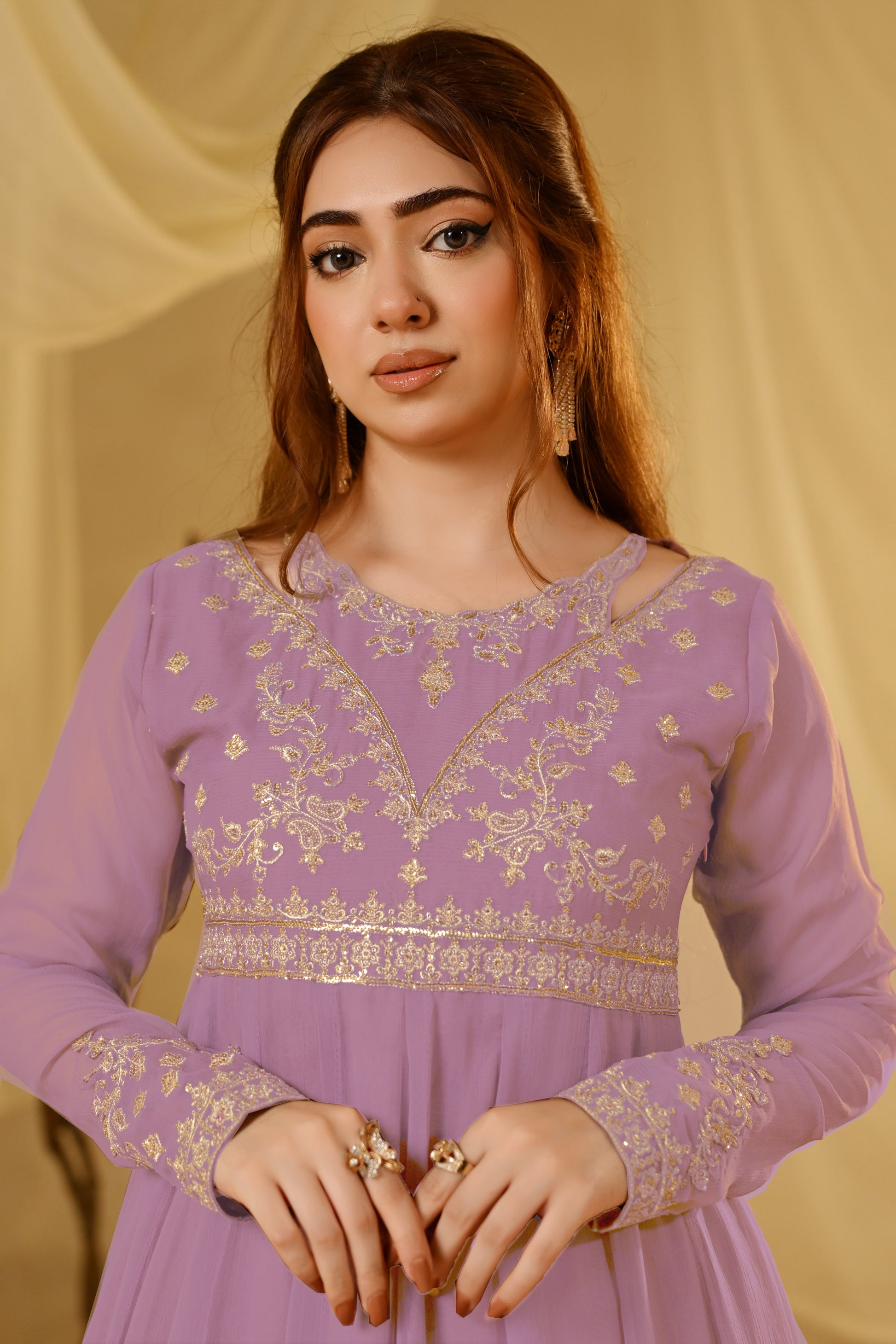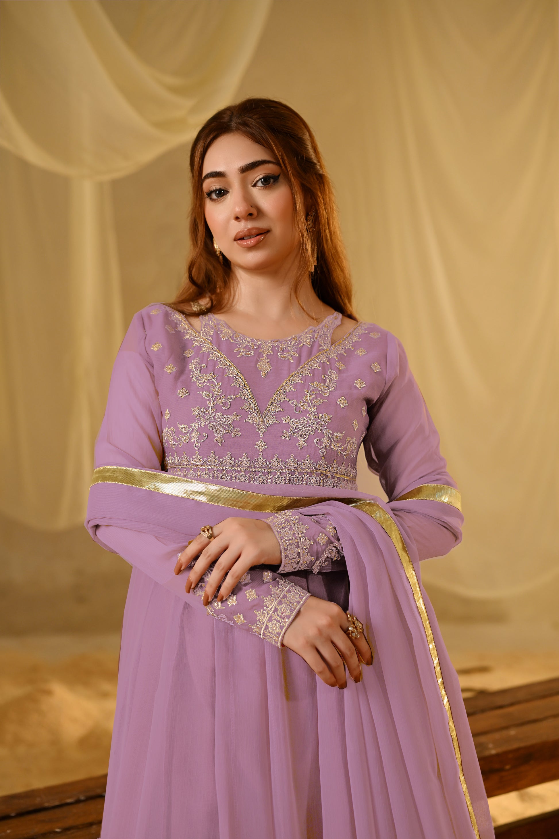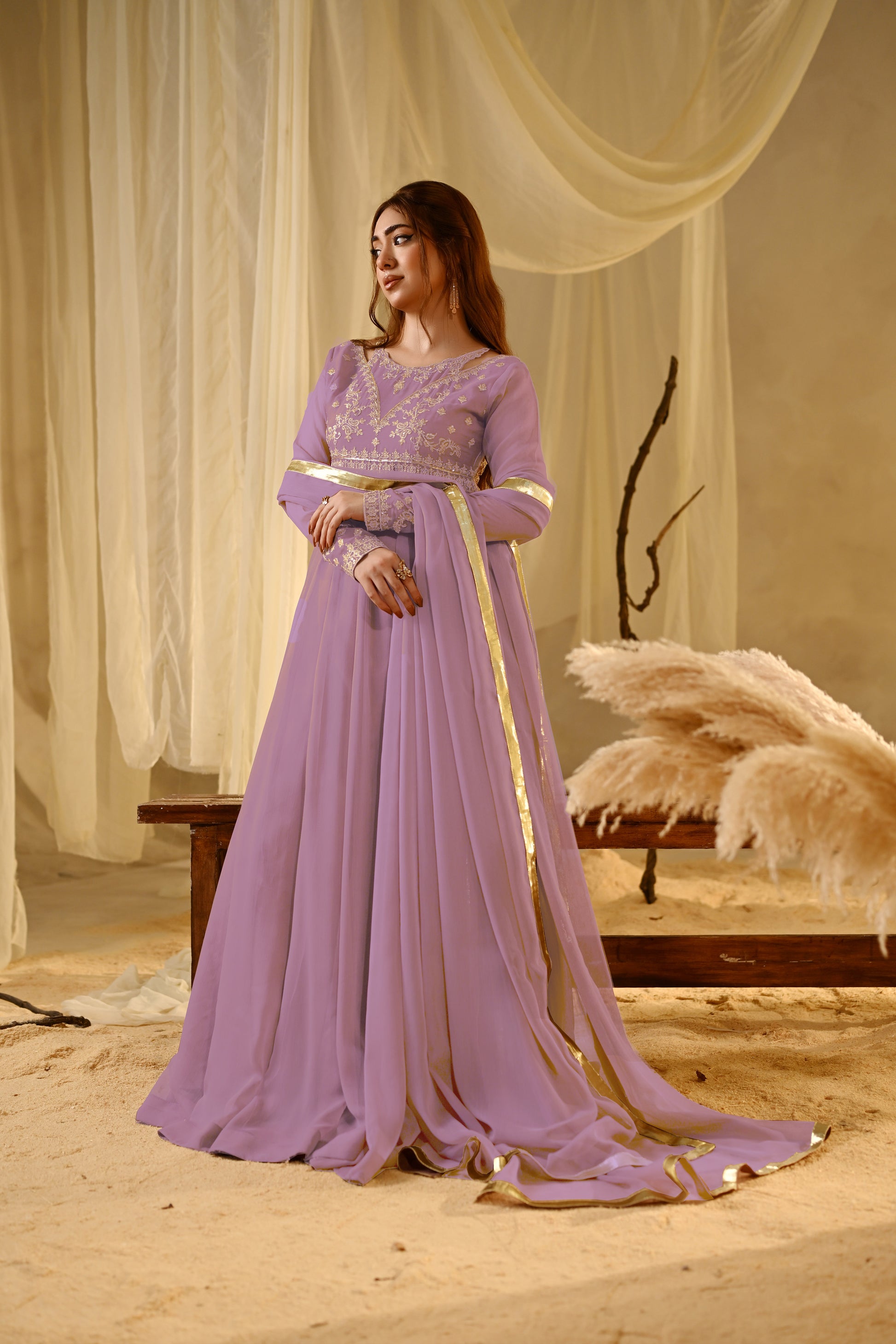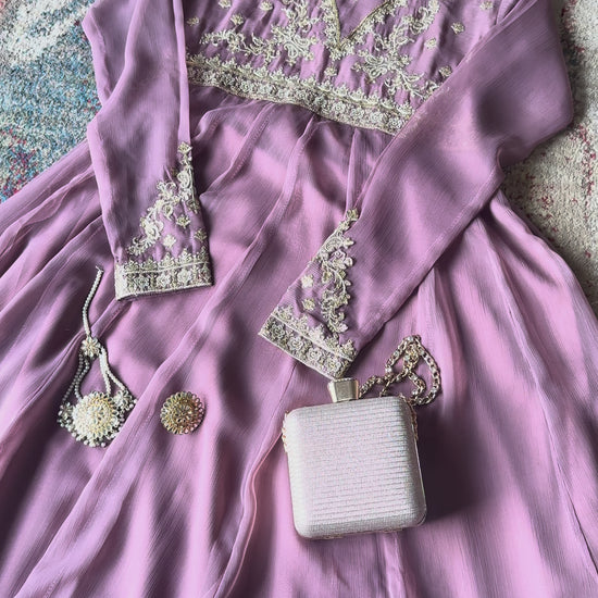 Minha Is A Speechless Expression Of Appearance In Lilac. Adorned With Exquisite Zari, Resham, And Sequin Embroidery, It Shows Off Intricate Detailing On The Embroidered Sleeves, Front Body, Back, A Soft Malai Inner Ensures Comfort,