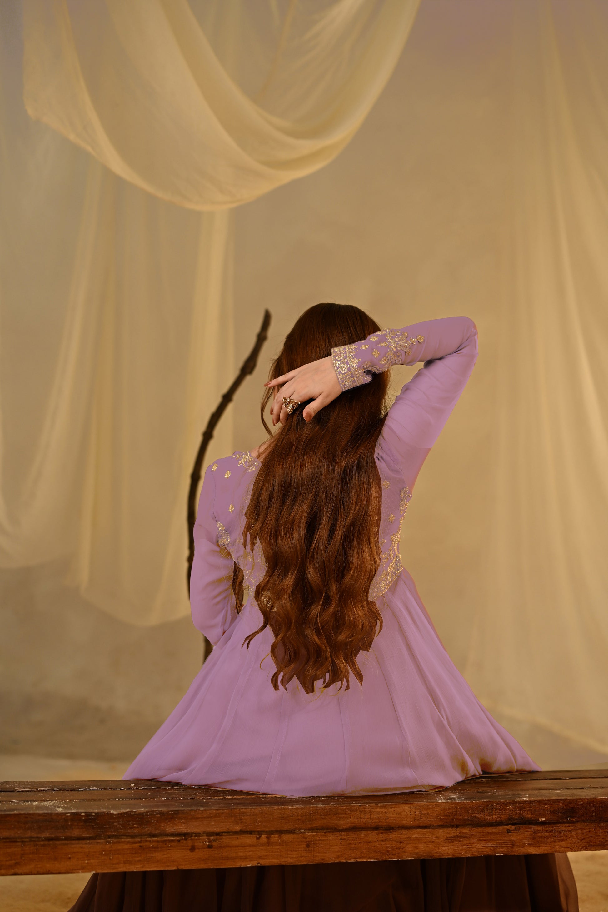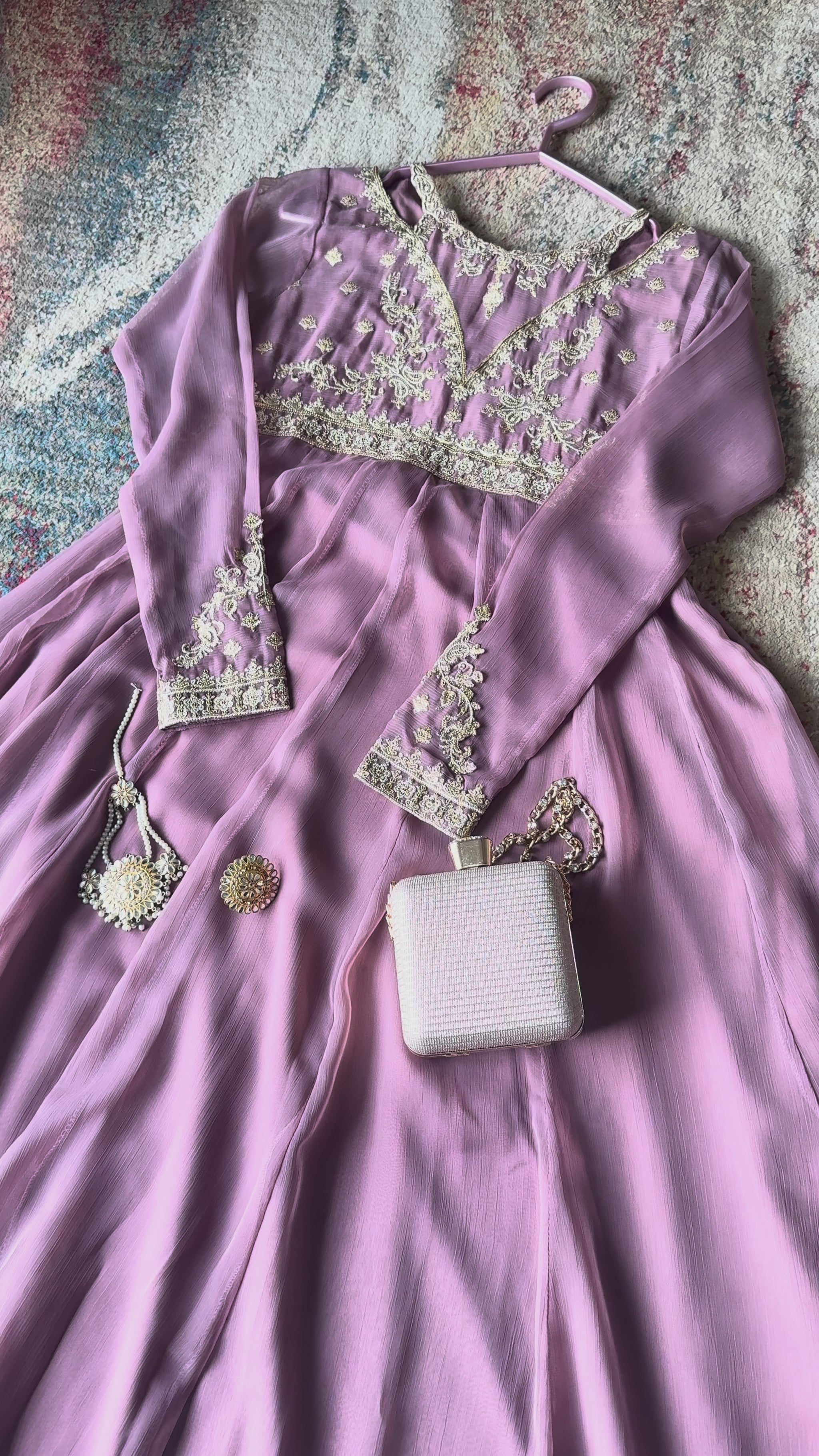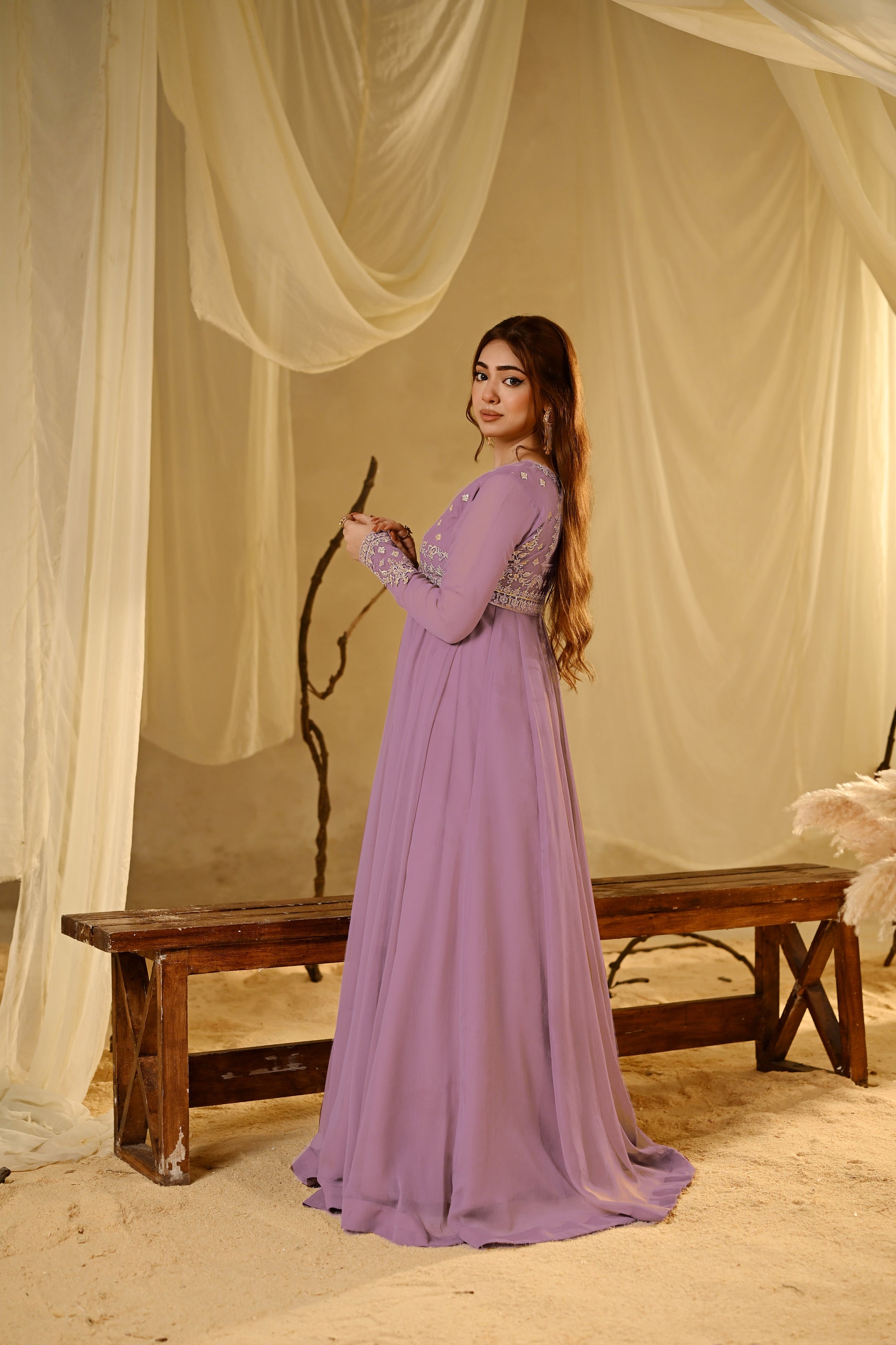 Minha Is A Speechless Expression Of Appearance In Lilac. Adorned With Exquisite Zari, Resham, And Sequin Embroidery, It Shows Off Intricate Detailing On The Embroidered Sleeves, Front Body, Back, A Soft Malai Inner Ensures Comfort,