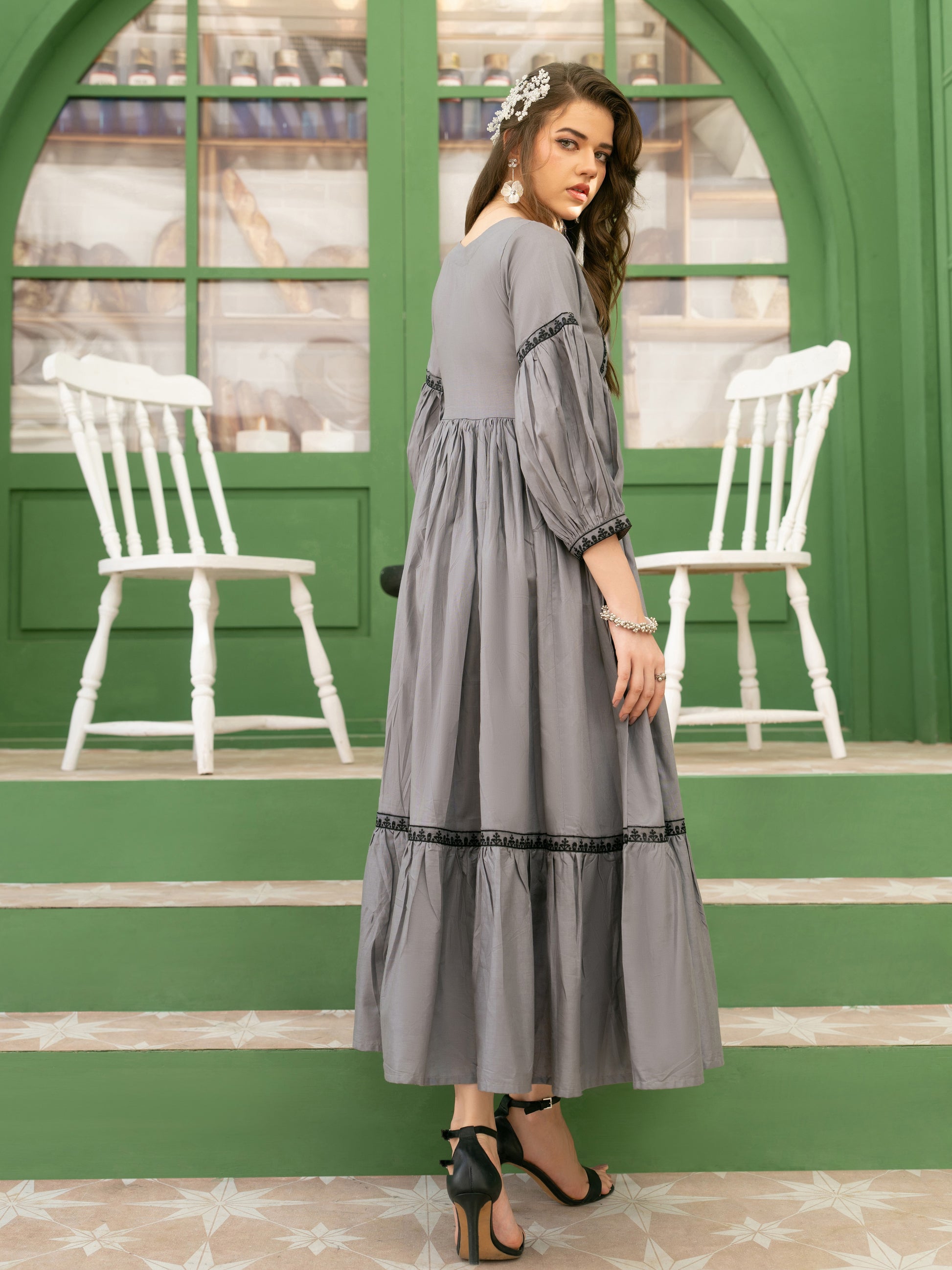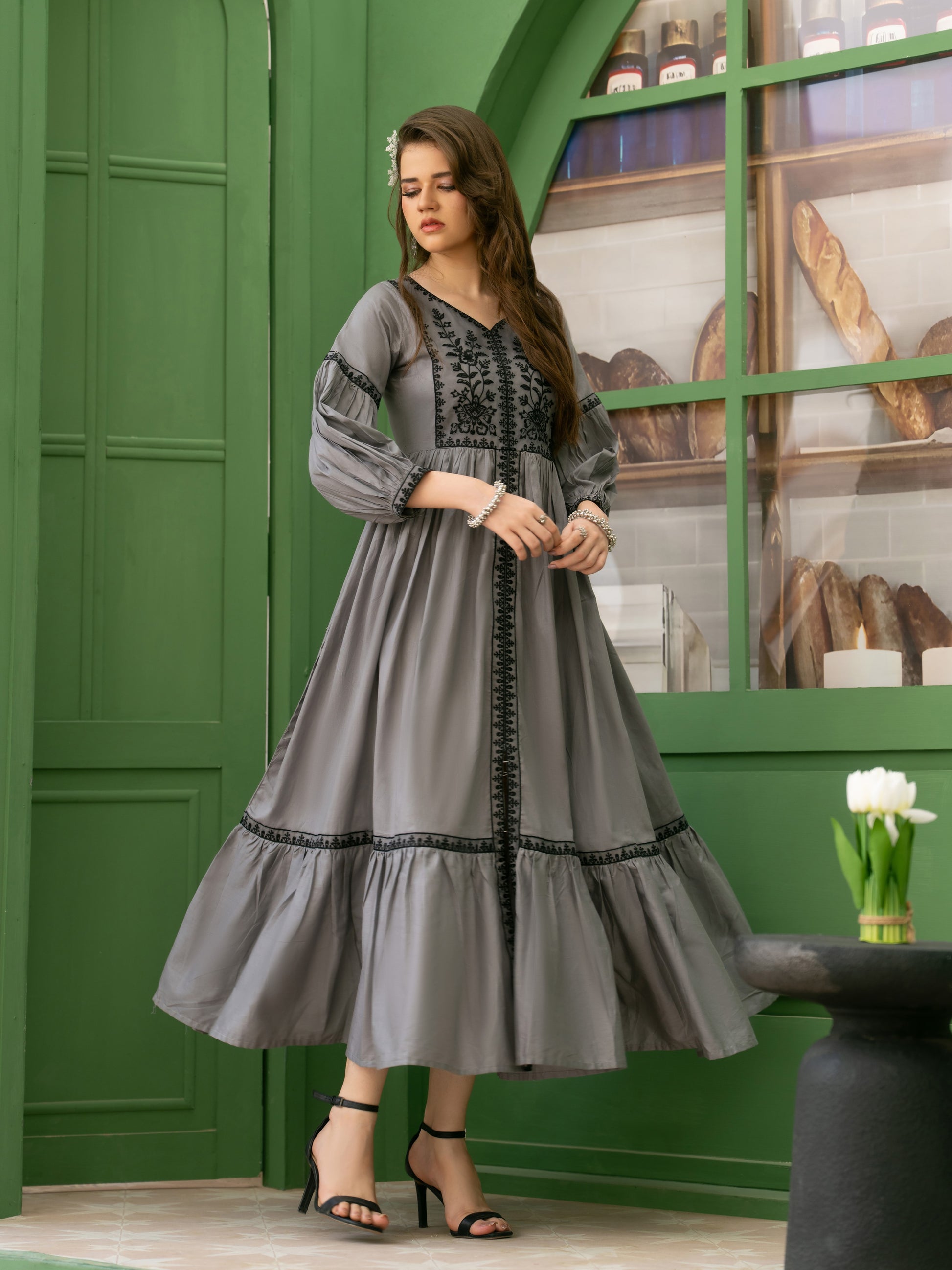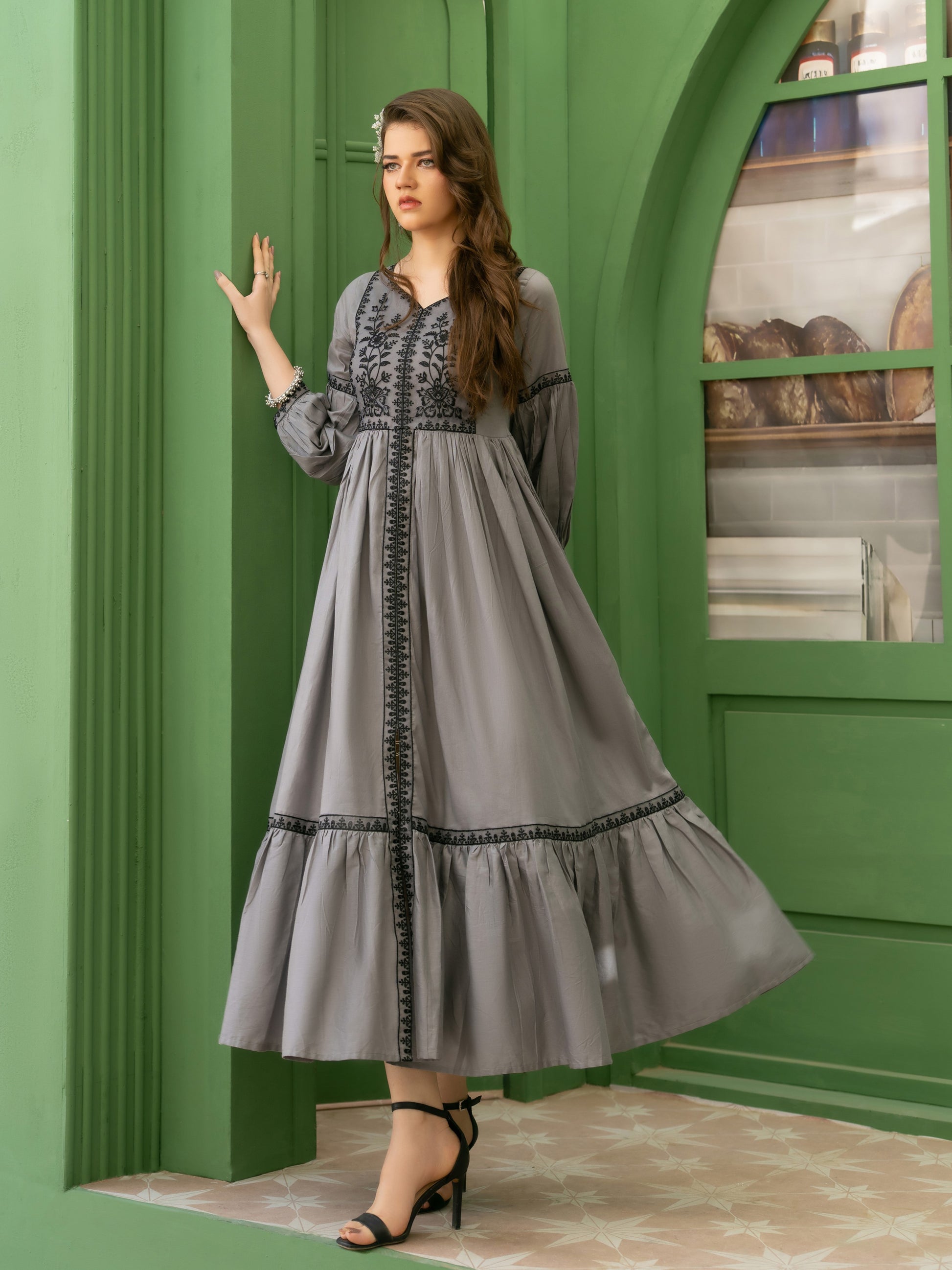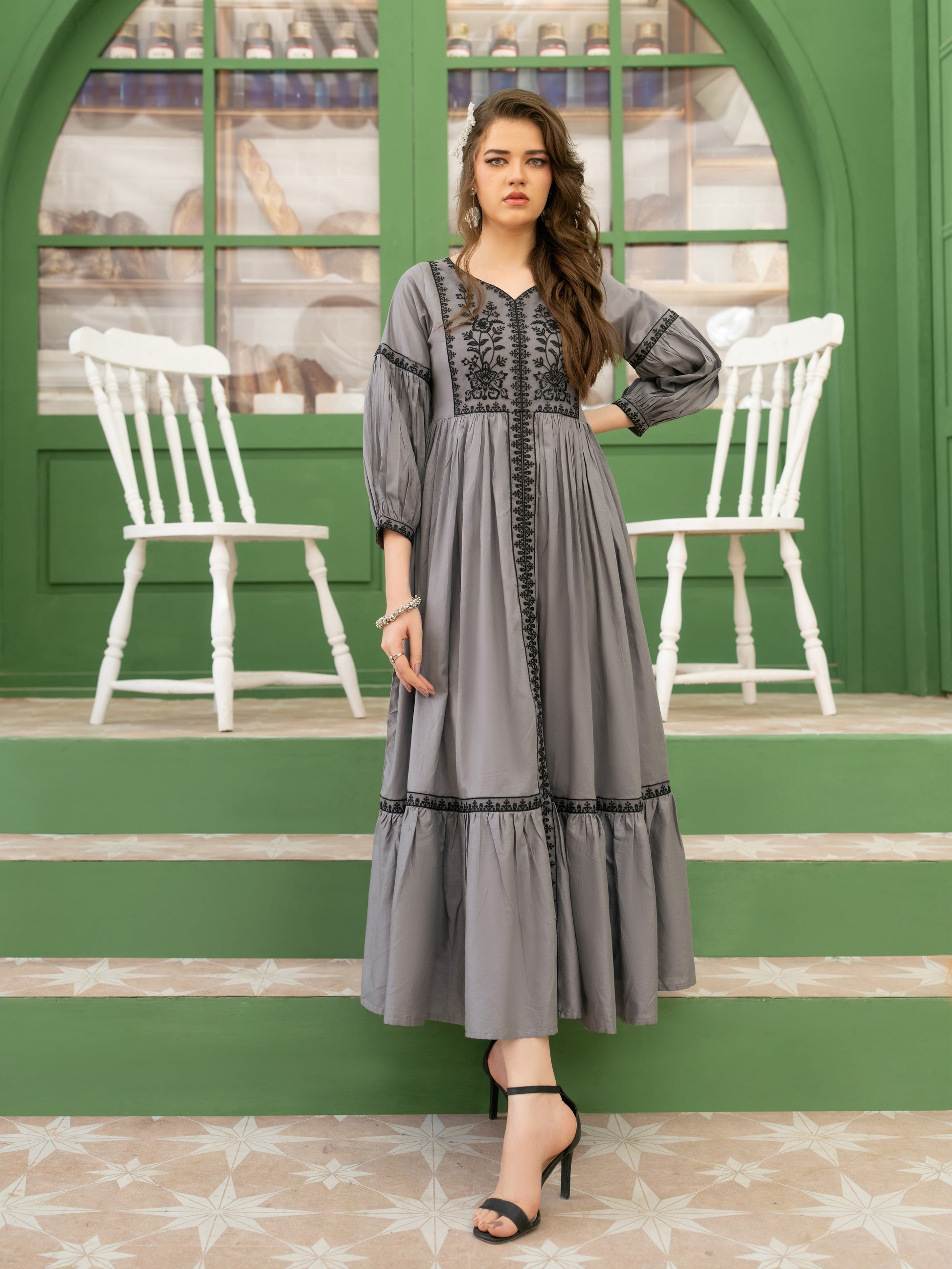 Introducing our Grey Black Embroidery Cotton Dress, a whimsical blend of playfulness and sophistication. This dress takes the classic grey cotton fabric to new heights with its charming black Embroidery details, adding a touch of delightful flair. The ruffled hem dances with every step, creating a sense of movement and grace that will make you feel like you're floating in the air.