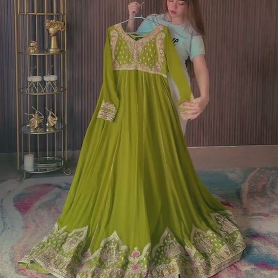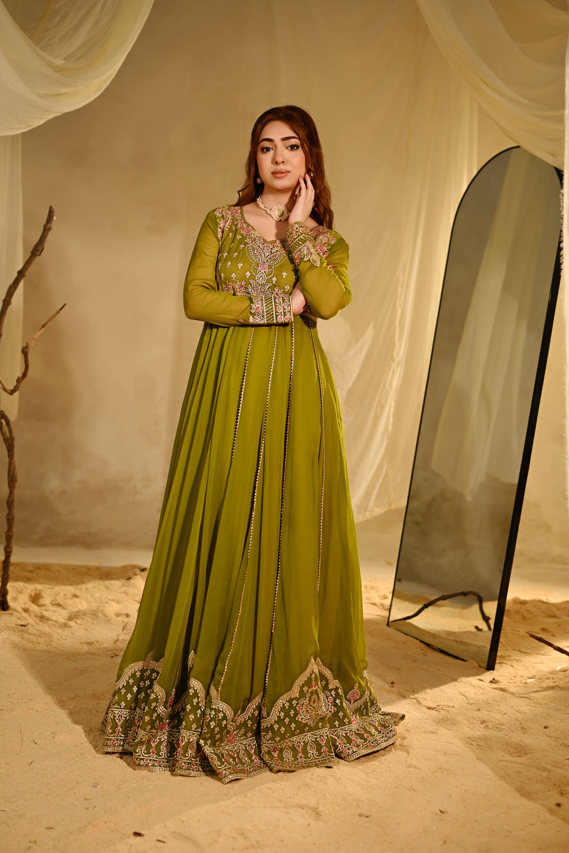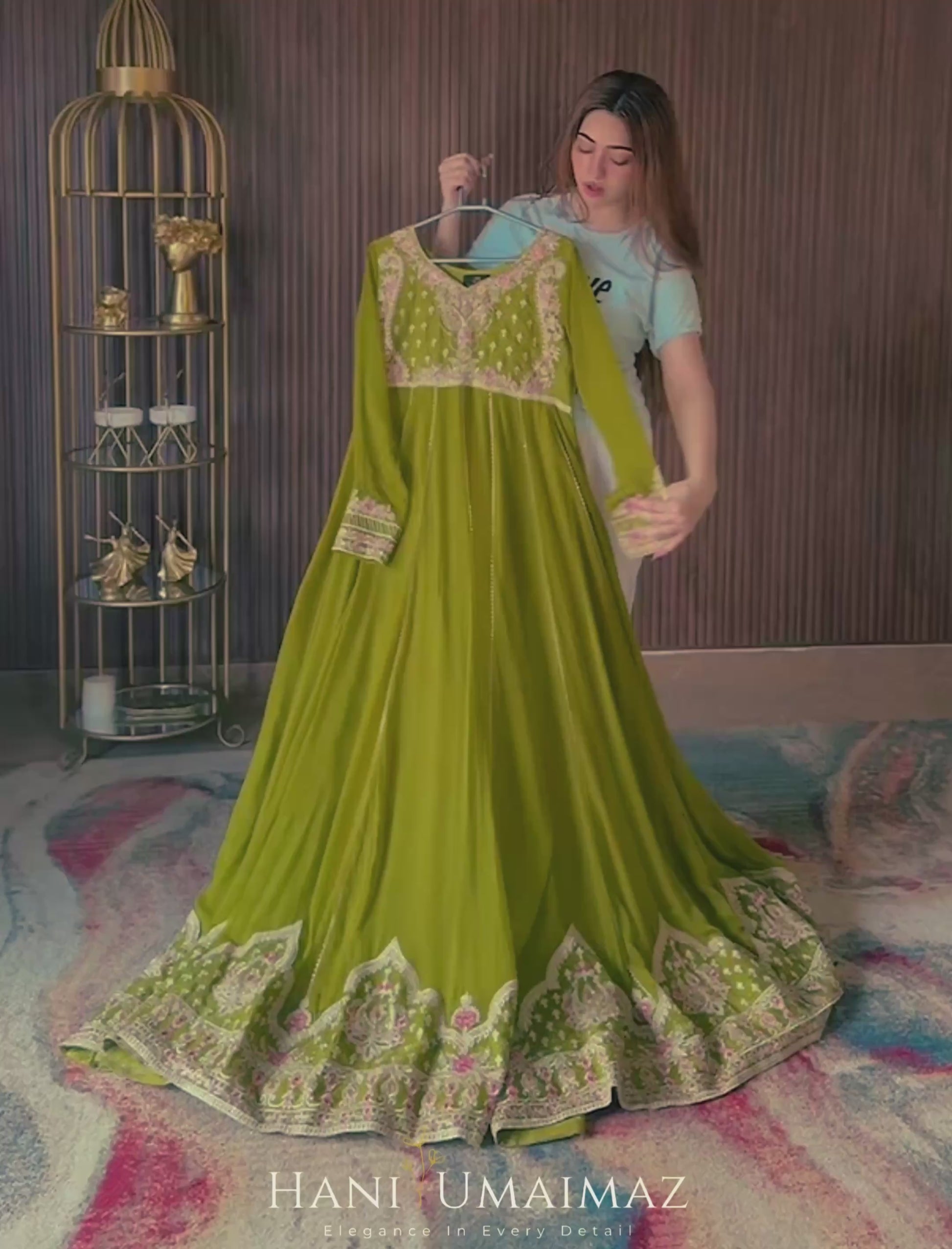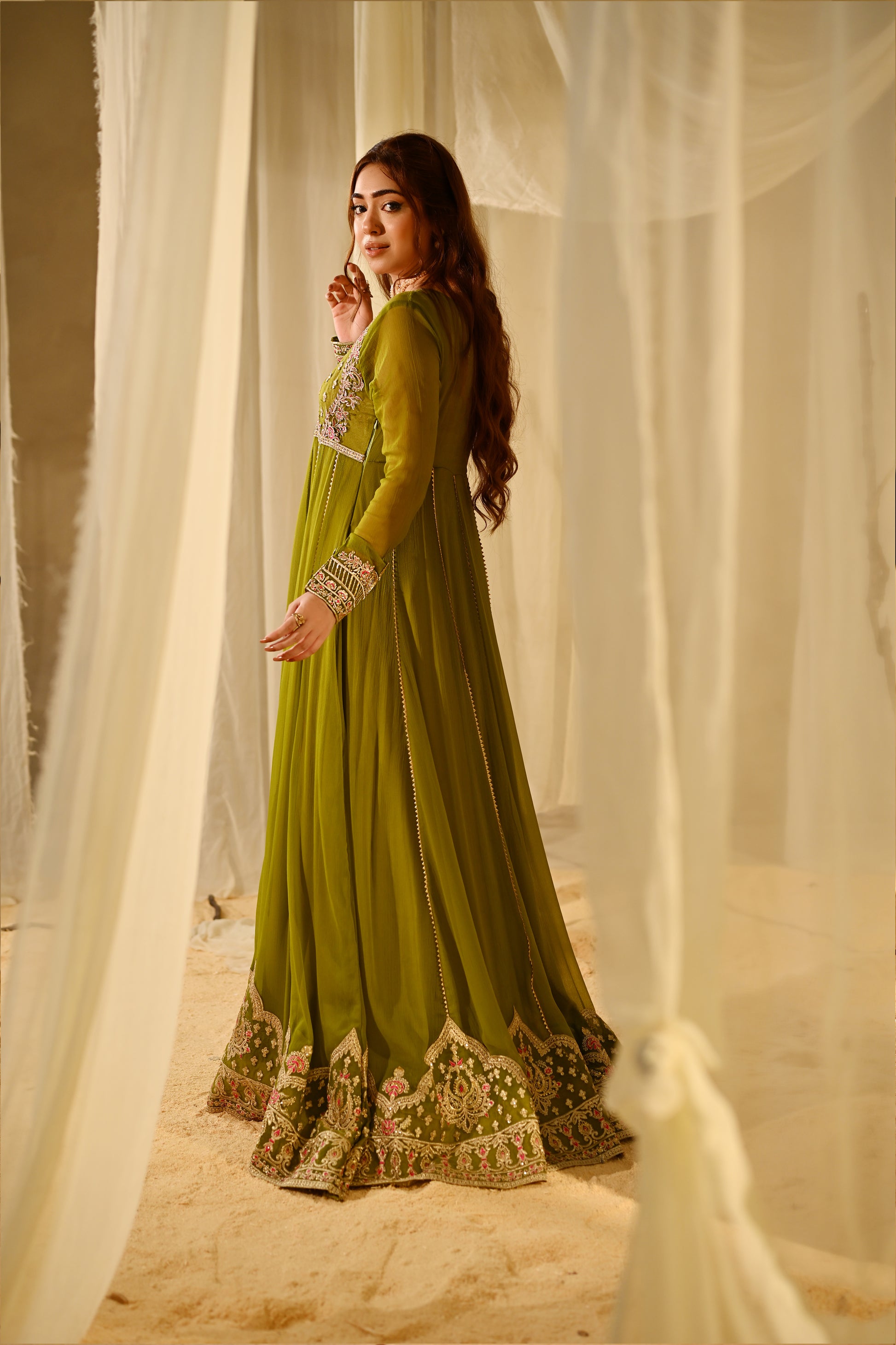 Embrace The Everlasting Elegance Of Nashmiya, Where Tradition Meets Refinement. Crafted In Chiffon, This Beautiful Pishwas Is Ornamented With Zari, Resham, And Sequin Needlework, Adding A Heavenly Glow To Its Artistry. The Intricately Embroidered Front Body, And Sleeves Radiate Sophistication, While The Five-Yard Flared Hem Flows Effortlessly, Making A Grand Silhouette.