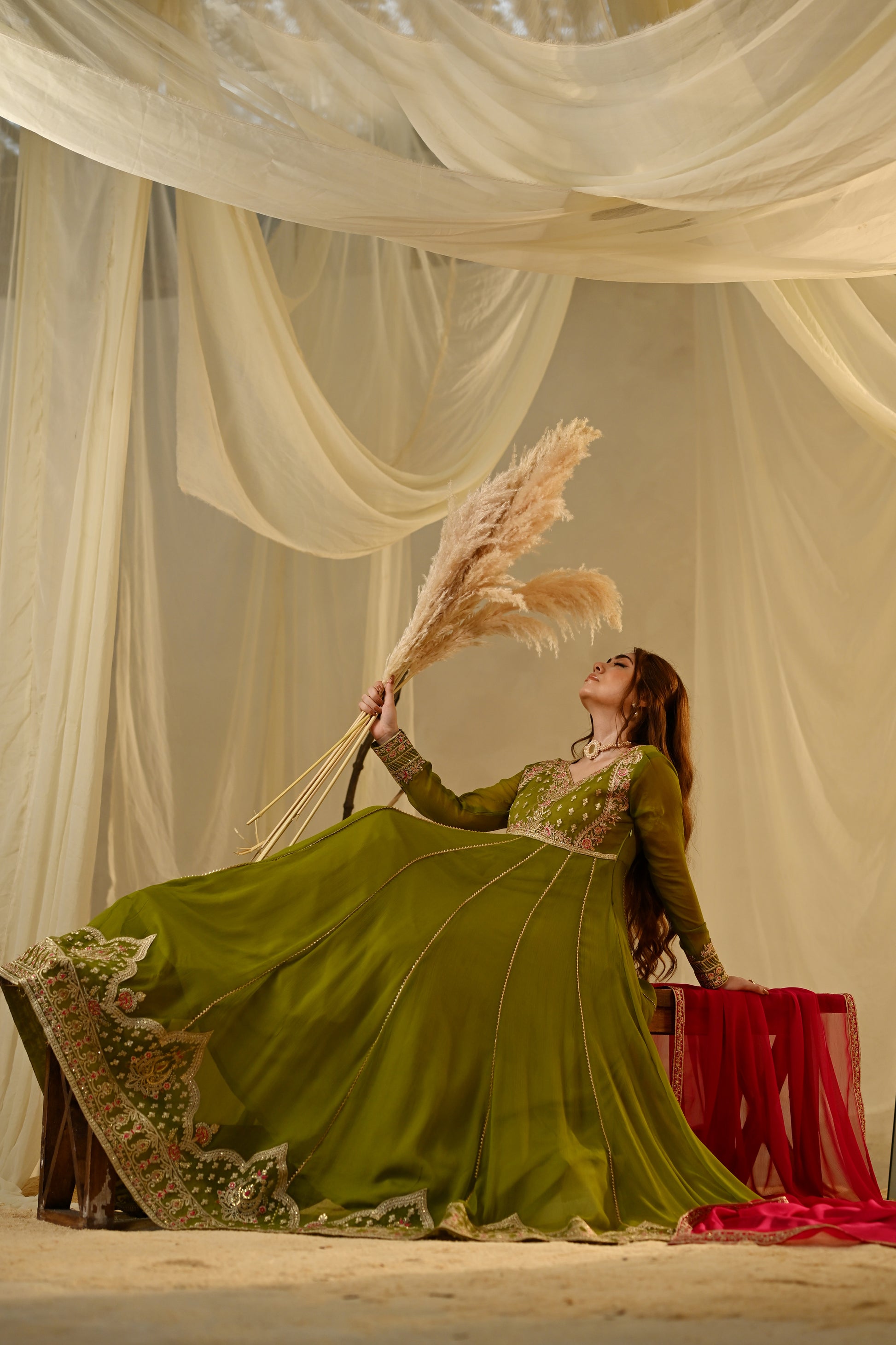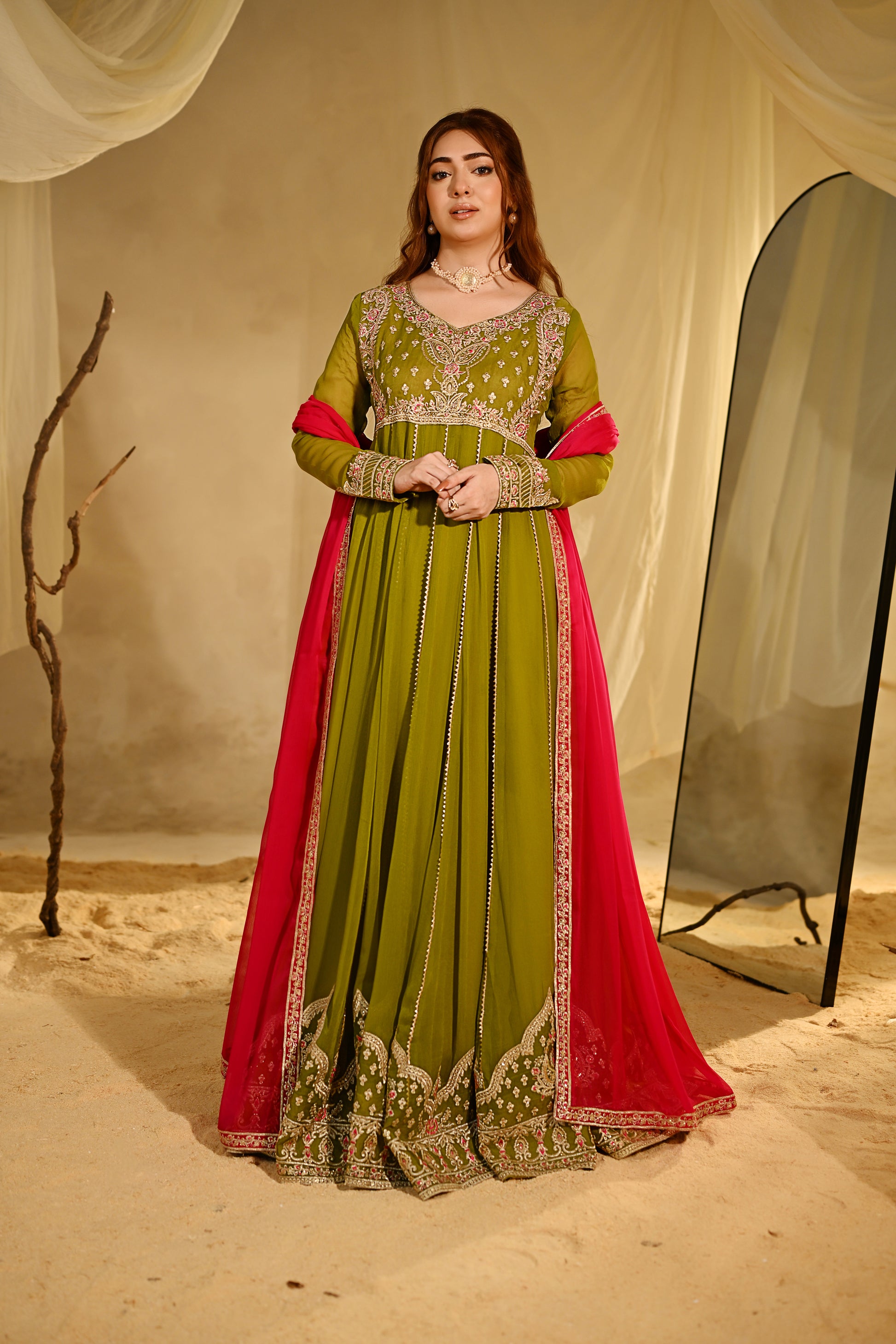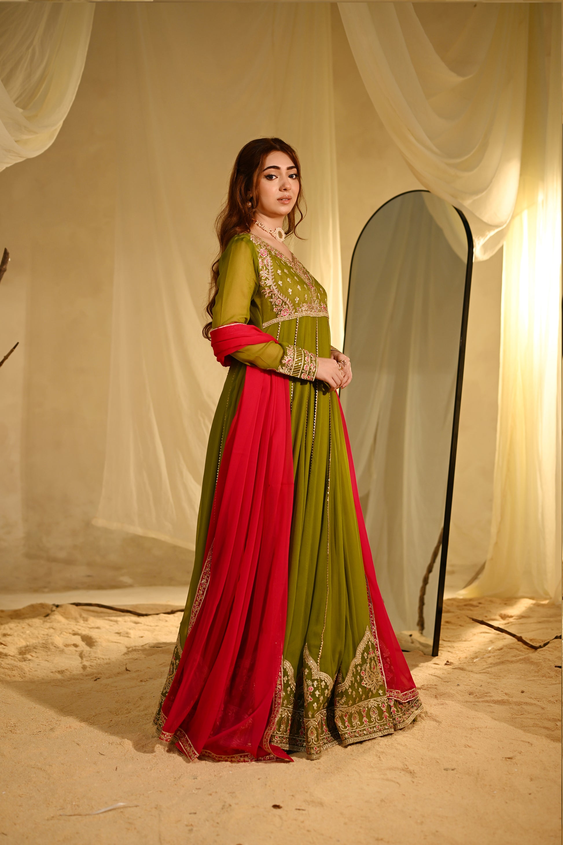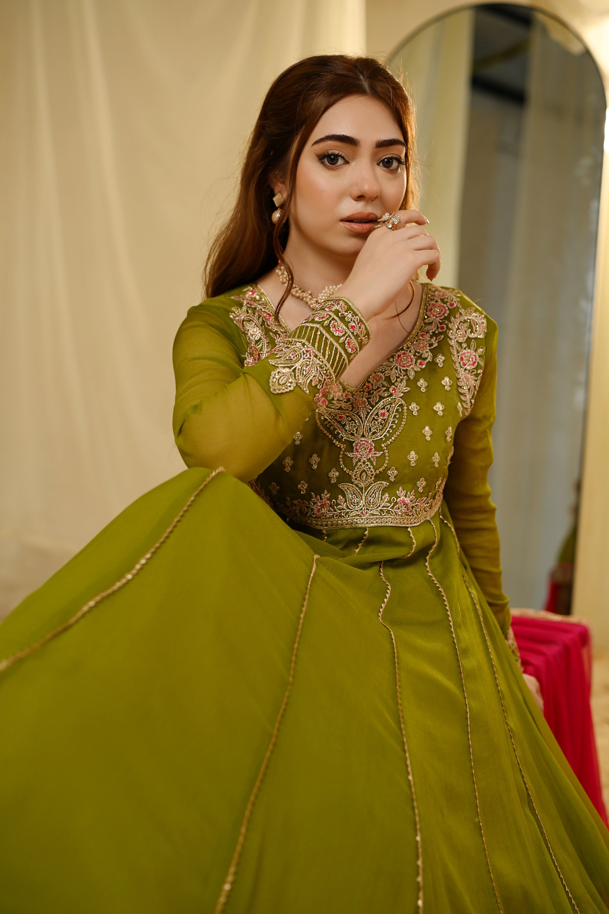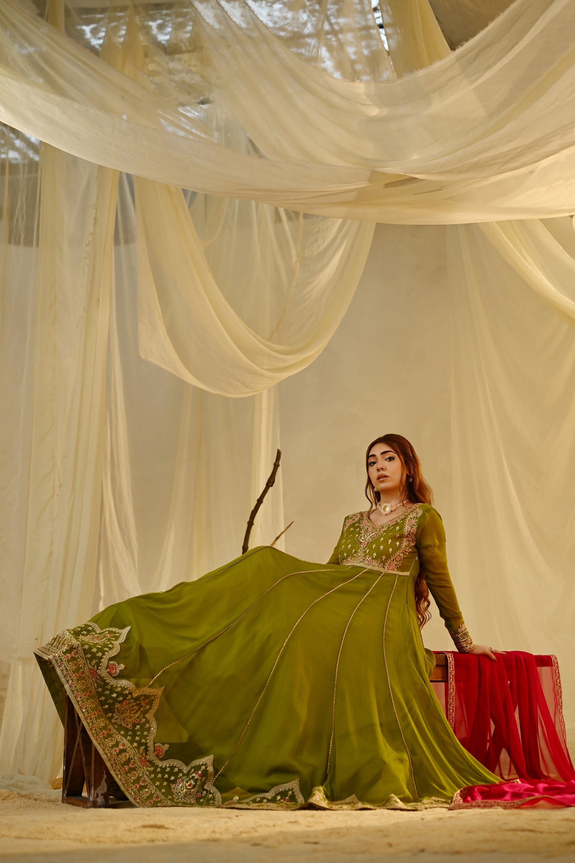 A Stitched Malai Inner Safeguards Ease And Opacity, Making Every Movement As Easy As It Is Elegant. The Ensemble Is Completed With A Chiffon Dupatta, Festooned With Four-Sided Embroidery, And Subtle Lace Detailing In The Kalis, Making Nashmiya A Joyful Ode To Heritage And Eternal Beauty.