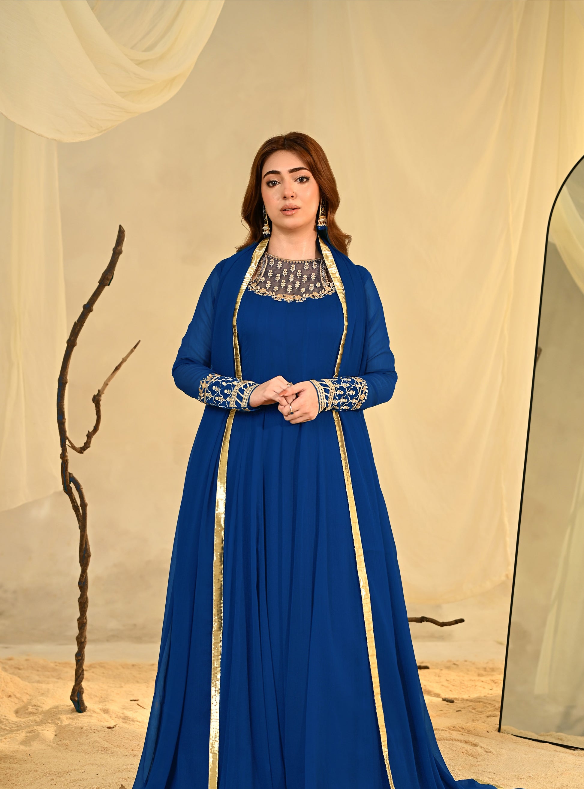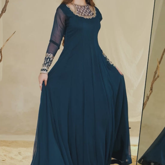 The Sleeves, Akin To Regal Crowns, Shimmer With Golden Embroidery At Their Heads, Bestowing An Air Of Majestic Charm. The Panels, In Perfect Harmony, Embrace Plain Simplicity, Letting The Neck And Sleeves Steal The Spotlight.