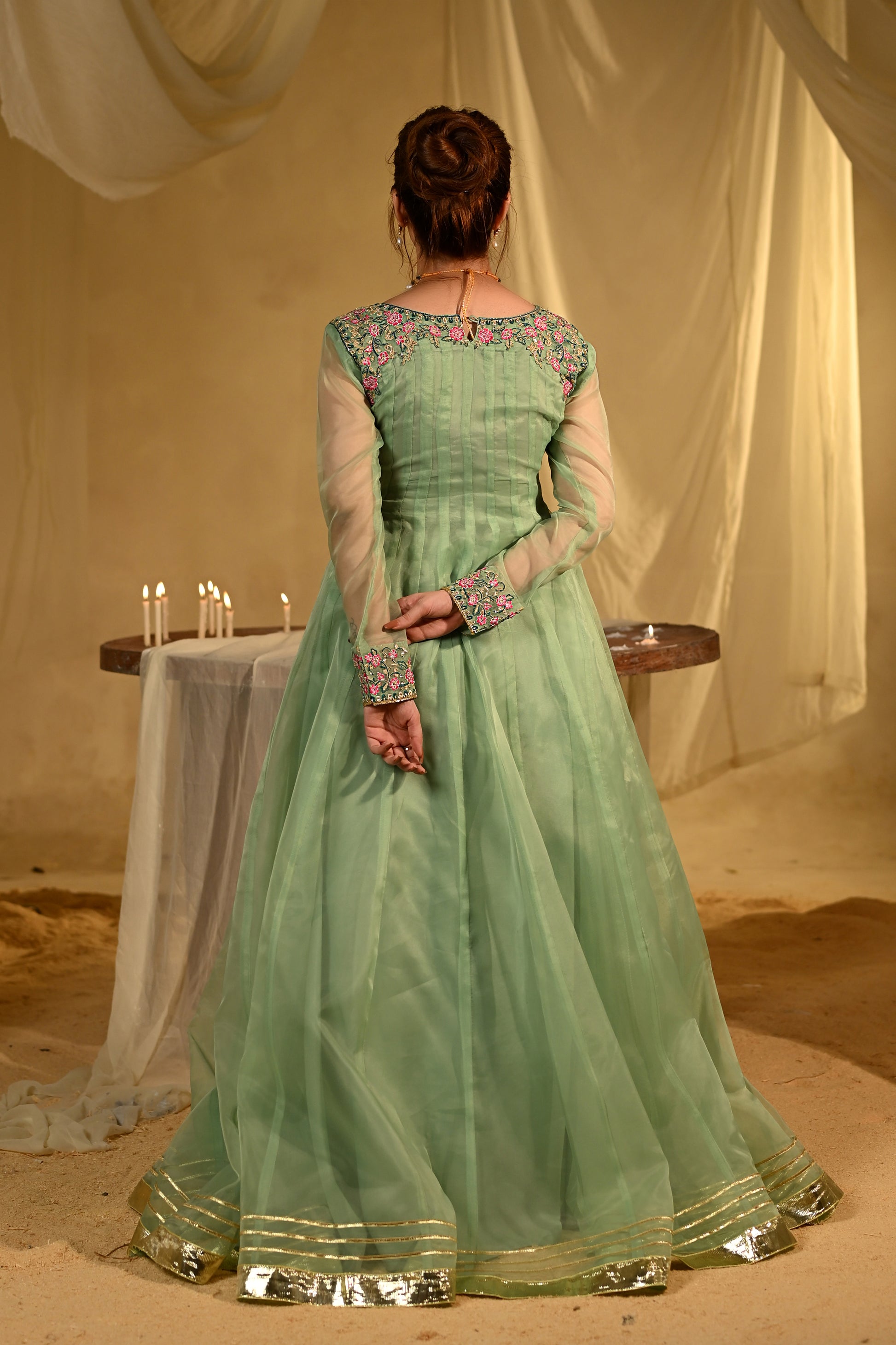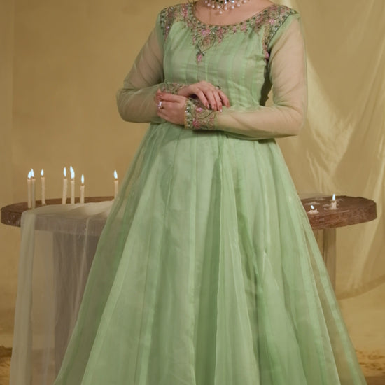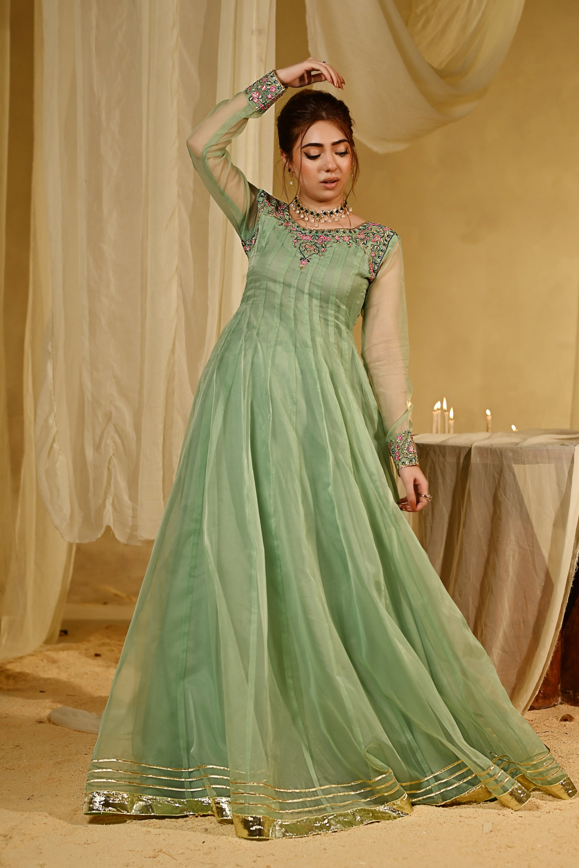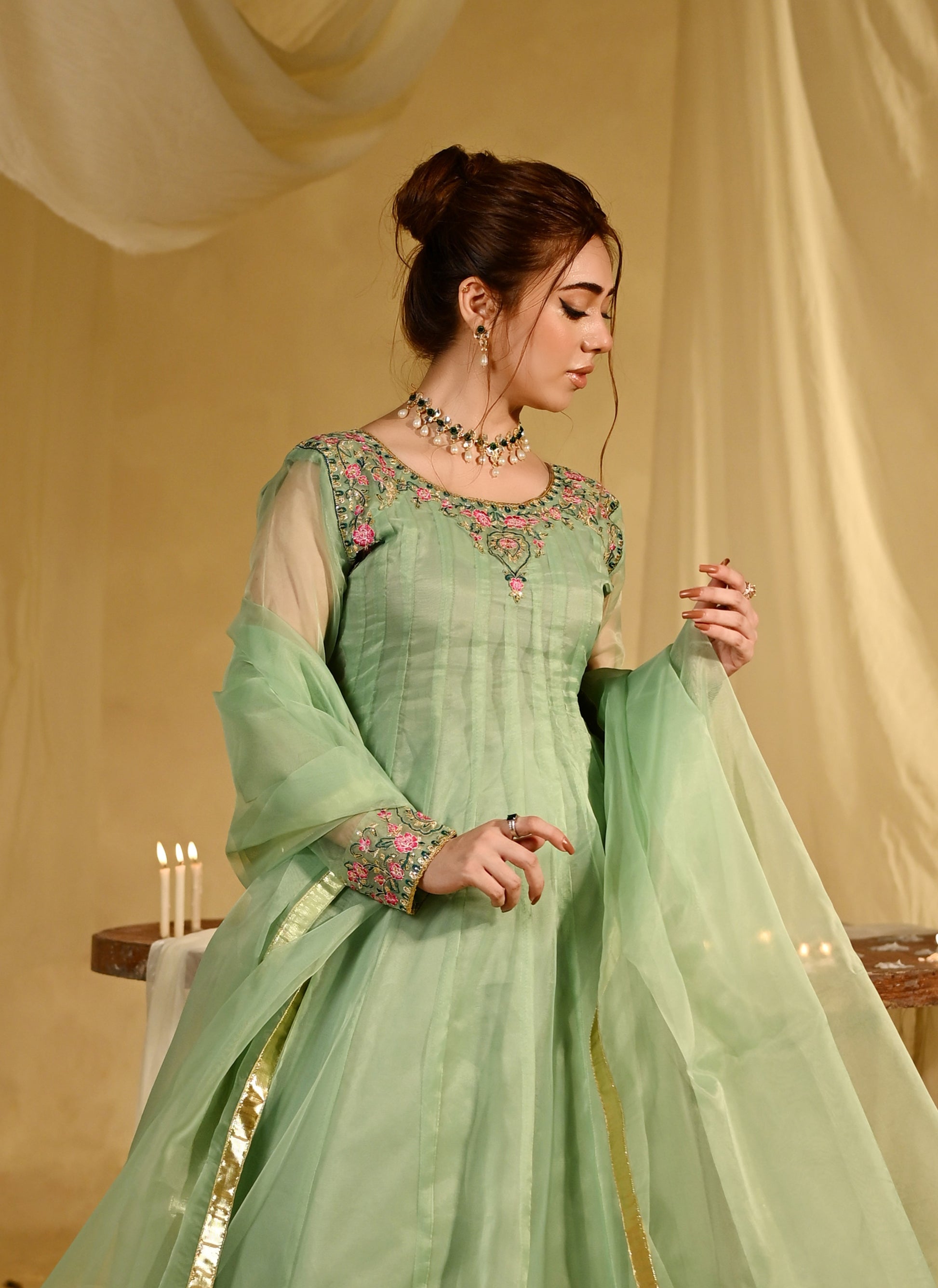 Drape Yourself In Negar, A Masterwork Of Beauty And Tradition. This Pistachio Green Organza Pishwas Is Ornamented With Intricate Zari, Resham, And Sequin Embroidery, Bringing A Royal Charisma To Every Stitch. The Delicately Embroidered Neckline Front , Back And Sleeves Radiate Elegance, While The Five-Yard Flared Hem, Finished With Malai Fabric Patti, Adds A Regal Flow To Your Movements. For effortless grace, a stitched malai inner is attached to the shirt, ensuring comfort and a non-see-through finish.