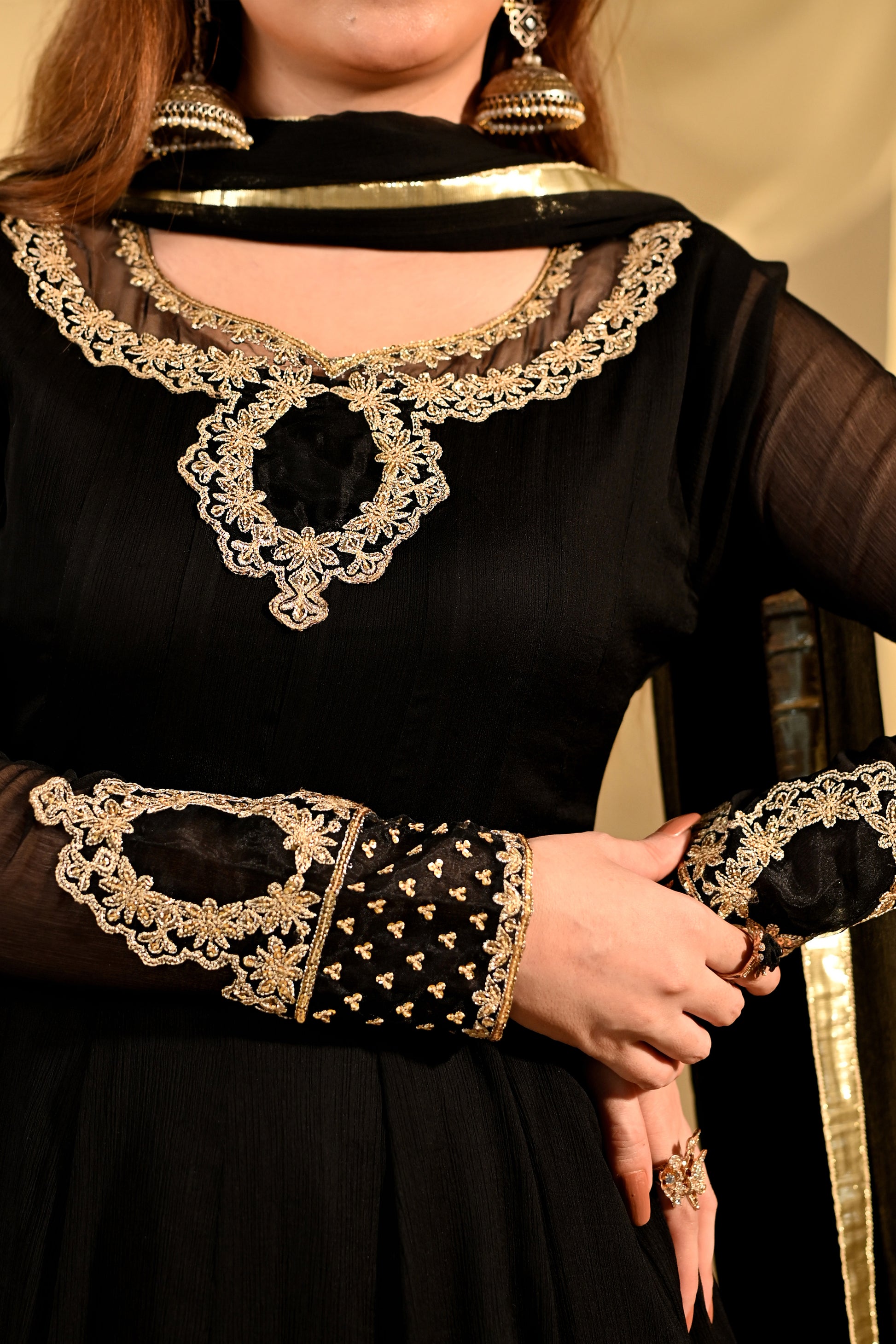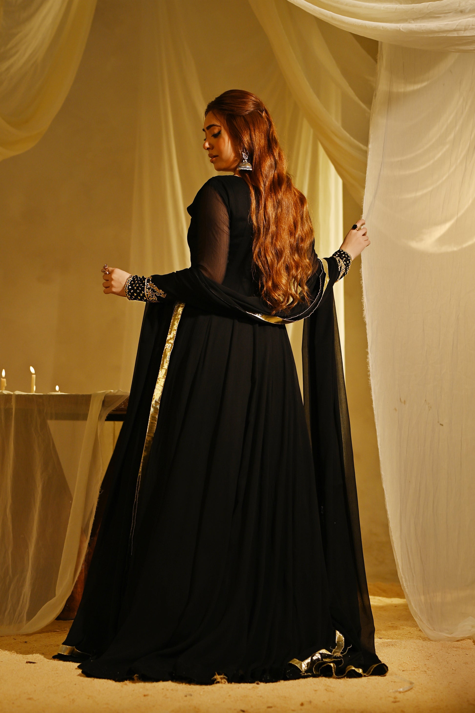 Drape Yourself In Abeer, A Masterwork Of Beauty And Tradition. This Black Chiffon Pishwas Is Ornamented With Intricate Zari, Resham, And Sequin Embroidery, Bringing A Royal Charisma To Every Stitch. The Delicately Embroidered Neckline And Sleeves Radiate Elegance, While The Five-Yard Flared Hem, Finished With Malai Fabric Patti, Adds A Regal Flow To Your Movements. For effortless grace, a stitched malai inner is attached to the shirt, ensuring comfort and a non-see-through finish.